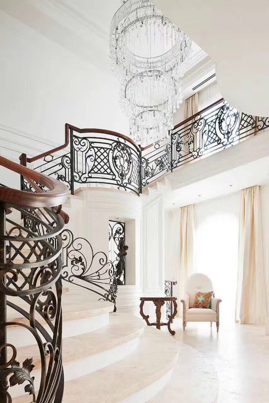 樓梯的設計非常精美,采用了鐵藝欄桿,欄桿上有復雜的卷曲花紋和裝飾圖案,呈現出一種古典而優雅的風格。樓梯的扶手是木質的,顏色為深棕色,與鐵藝欄桿形成了鮮明的對比。